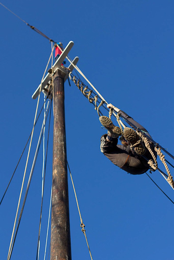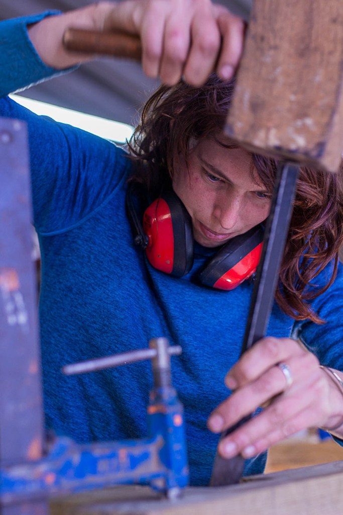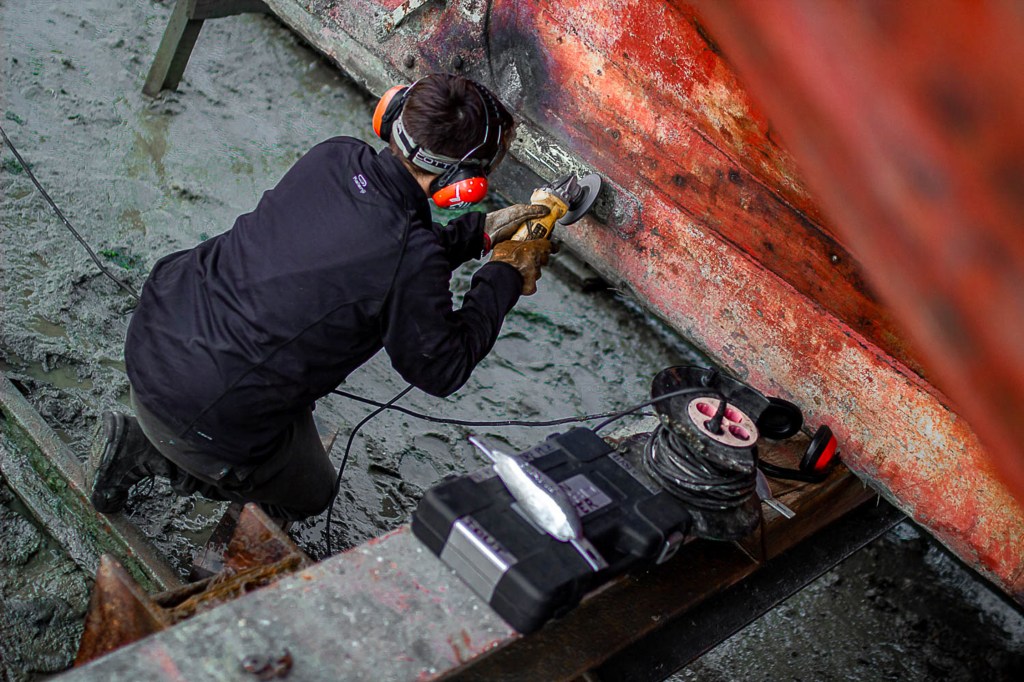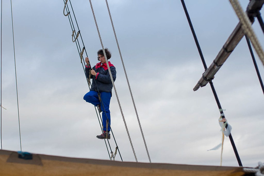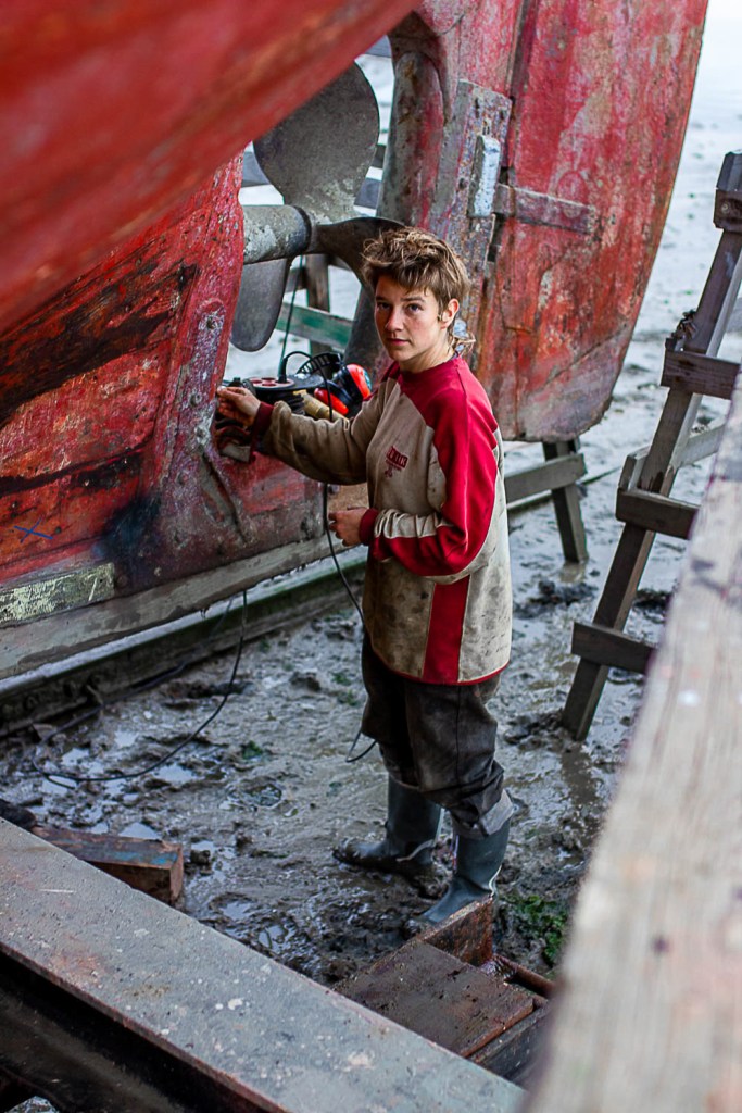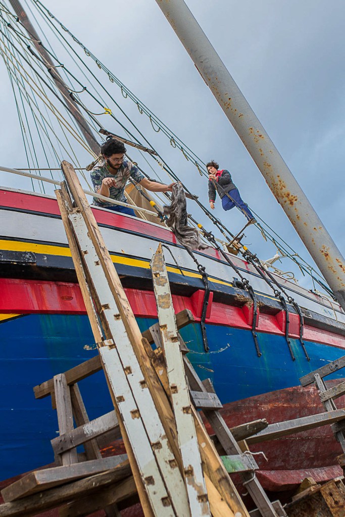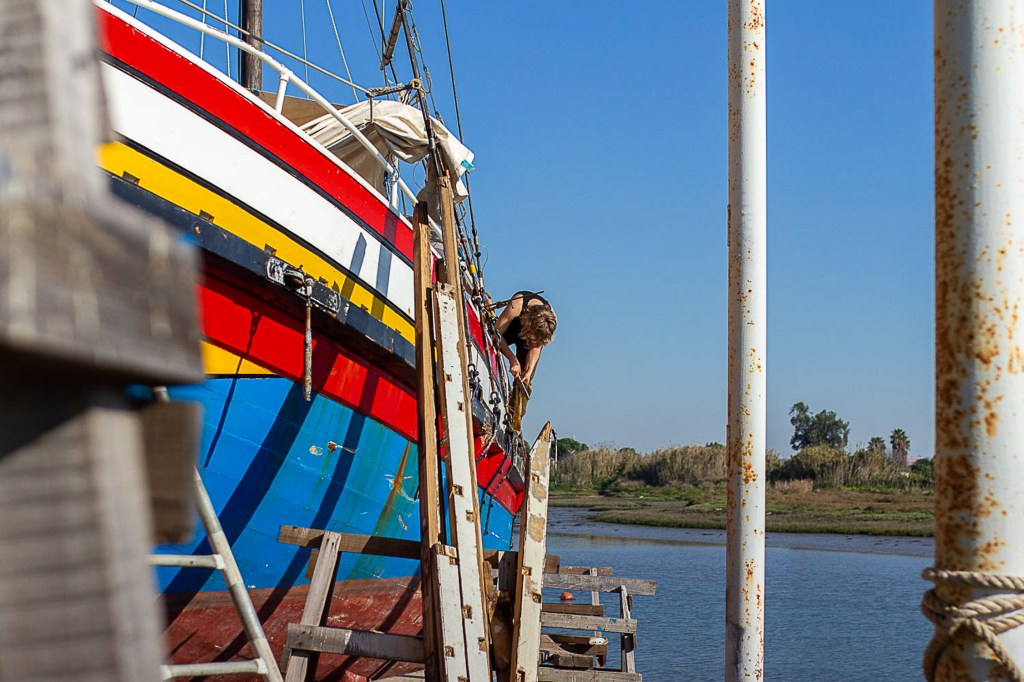 Début 2020, j’ai décidé d’embarquer pour de nouvelles aventures. J’ai largué mes amarres bretonnes pour participer à un chantier bénévole en non mixité choisie autour du bateau Albarquel au Portugal. Lisbonne de l’autre côté du rivage, sur les rives du Tage, à Sarilhos Pequenos plus exactement, notre petit groupe prenait le relai des travaux de réfection de ce ketch aurique au chantier de Mestre Jaime. Construit en 1957, il se consacrait au transport du sel depuis les salines du Sado, fleuve au sud du Portugal, jusqu’aux différents ports morutiers portugais. Albarquel connut plusieurs vies, et de port en port, il est arrivé à Marseille où l’association militante Les Bordées propose de faire découvrir la mer au plus grand nombre (https://www.helloasso.com/associations/les-bordees). Favorisant la transmission de compétences et l’apprentissage horizontal et par « le faire », Les Bordées convoie l’Albarquel jusqu’au Portugal, où celui-ci renoue avec ses racines le temps d’un petit coup de neuf durant l’hiver, avec le soutien d’un chantier naval traditionnel portugais.