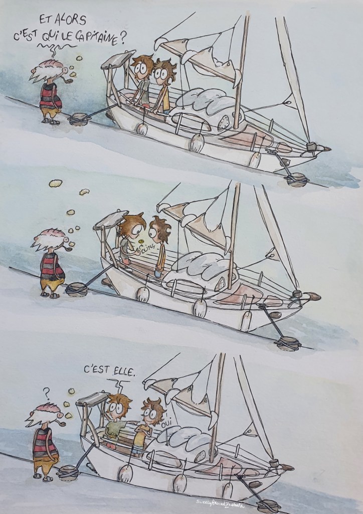 Sophie : Puis, on a commencé à mettre sur Instagram. Et comme des personnes suivaient notre compte, on s’est dit qu’il fallait poster un dessin par semaine. Désormais, c’est vraiment un autre exercice car on ne dessine plus des anecdotes intimes mais des anecdotes sur ce qu’on voit du milieu de la voile. Cela nous permet également de nous exprimer sur ce qui nous choque au moyen de l’humour qui permet de temporiser.
