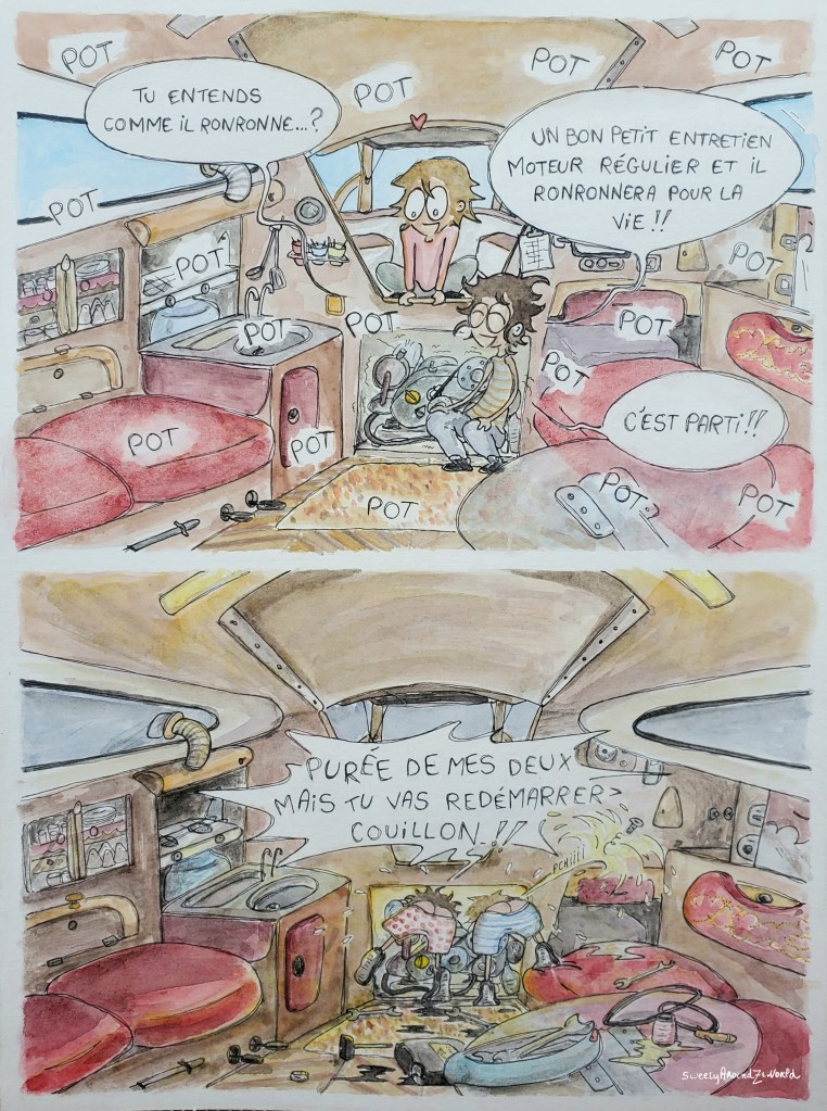 Sarah : Oui, on aimerait bien créer des événements conviviaux, comme des expos, des vernissages pour montrer nos planches selon les ports où l’on se trouve, et les gens pourraient y venir boire un coup. Par ailleurs, ça nous plairait bien aussi de faire un livre du genre La voile pour les nuls, avec les choses à ne pas faire, sur le ton de l’humour.